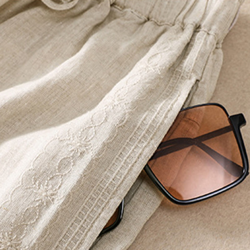 Buddha Stones Casual Floral Embroidery Pattern Drawstring Cotton Linen Women's Shorts With Pockets