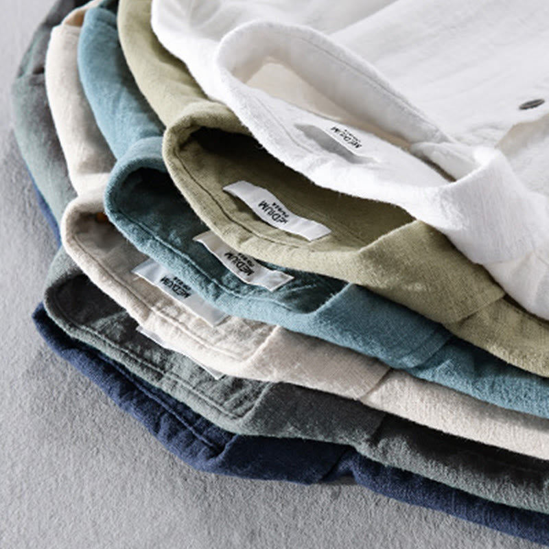 Buddha Stones Men's Pure Color Lapel Buttons Simple Design Ramie Cotton Long Sleeve Shirt
