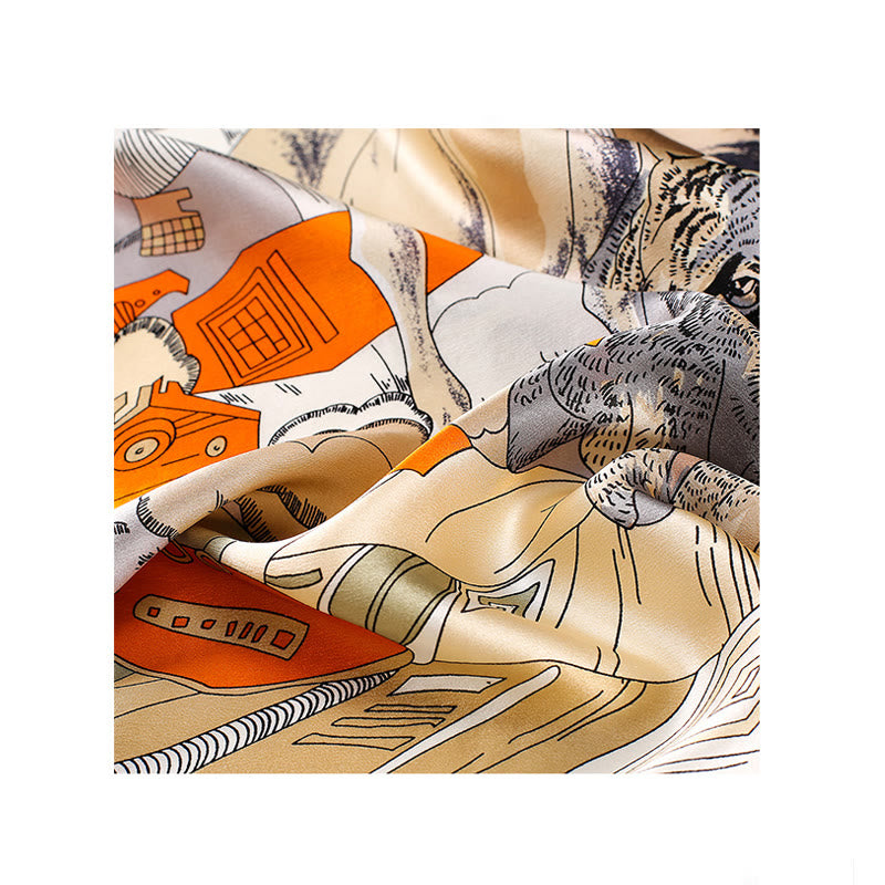 The design inspiration comes from oil paintings, snow scenes of the city, blue lotus in the ancient castle, sailing travel, animal world. The bold color matching makes the color of the silk scarf more brilliant, bringing you a unique charm.