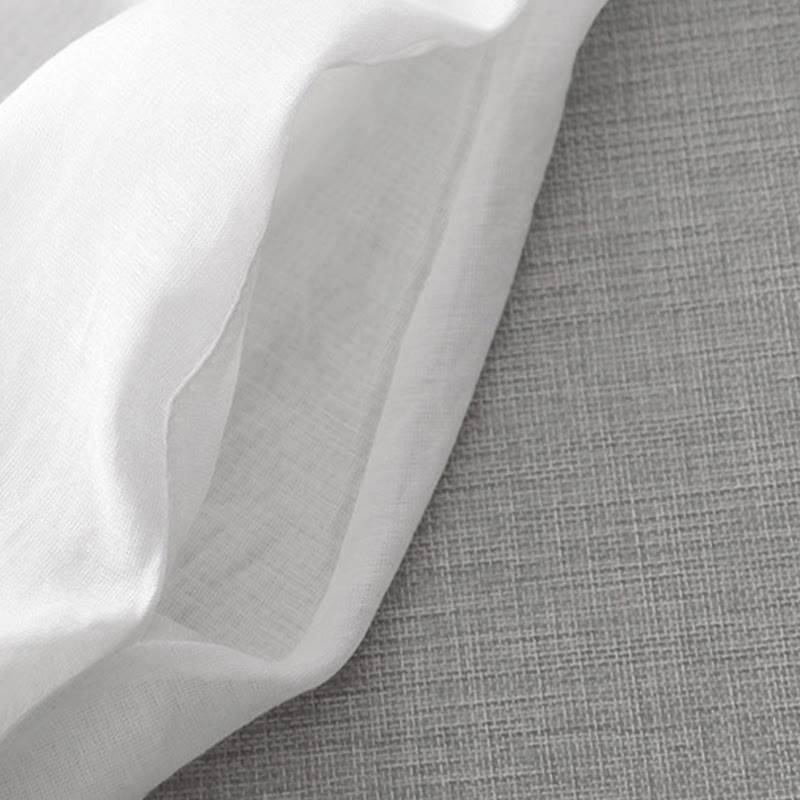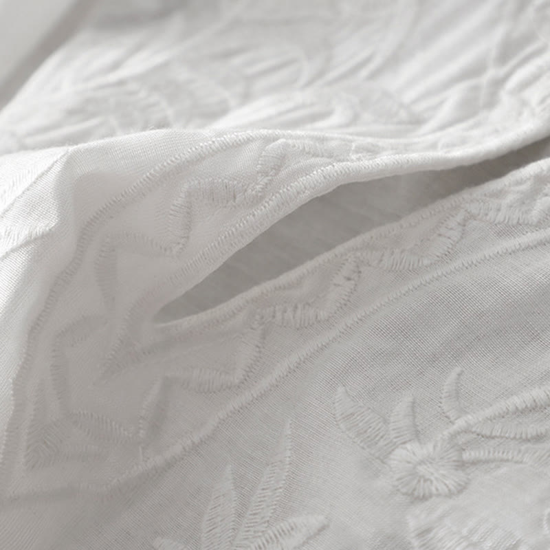 Buddha Stones Summer White Pure Color Embroidery Leaf Flower V-Neck Short Sleeve Midi Dress With Pockets