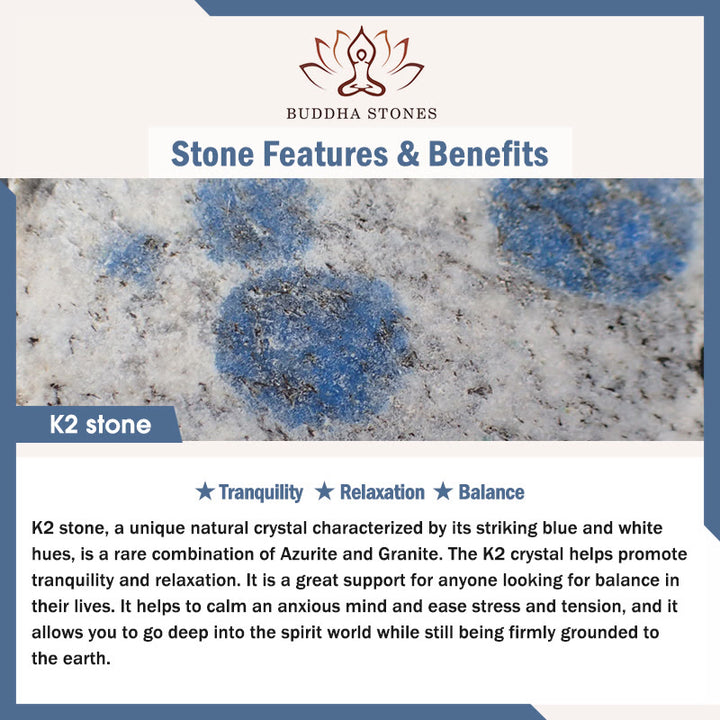 K2 stone, a unique natural crystal characterized by its striking blue and white hues, is a rare combination of Azurite and Granite. The K2 crystal helps promote tranquility and relaxation. It is a great support for anyone looking for balance in their lives. It helps to calm an anxious mind and ease stress and tension, and it allows you to go deep into the spirit world while still being firmly grounded to the earth.