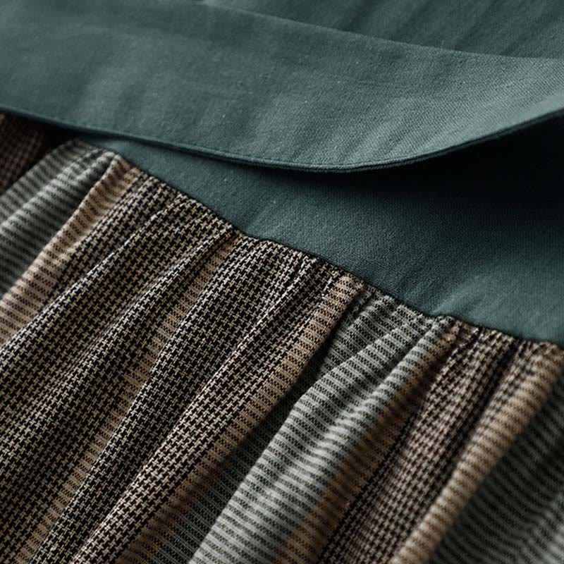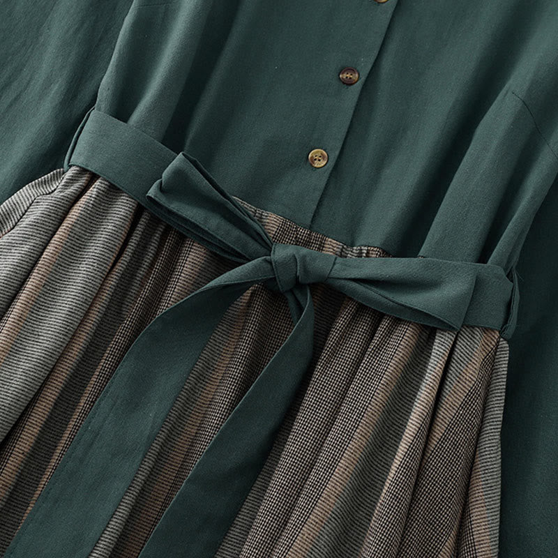 Buddha Stones Lapel Color Blocking Design Long Sleeve Cotton Midi Dress With Pockets