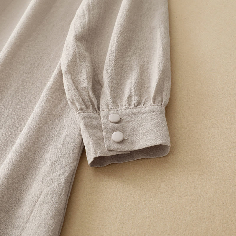 Buddha Stones Pure Color Stand Collar Double-breasted Buttons Design Cotton Long Sleeve Midi Dress