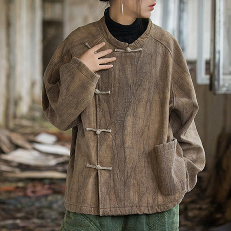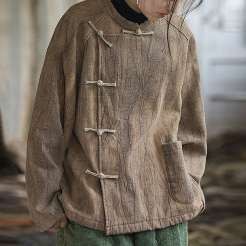 Buddha Stones Solid Color Frog-button Thermal Long Sleeve Ramie Linen Women's Shirt