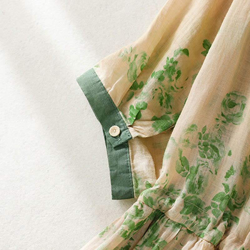 Buddha Stones Printing Buttons Drawstring High Waist Short Sleeve Cotton Midi Dress With Pockets - image 8