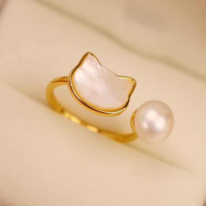 Buddha Stones Natural Pearl Copper Cat Healing Necklace Pendant Earrings - White-Ring(Adjustable) - image 9