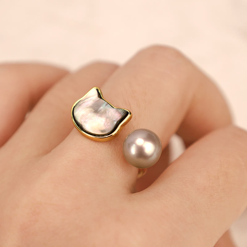 Buddha Stones Natural Pearl Copper Cat Healing Necklace Pendant Earrings - Black-Ring(Adjustable) - image 2