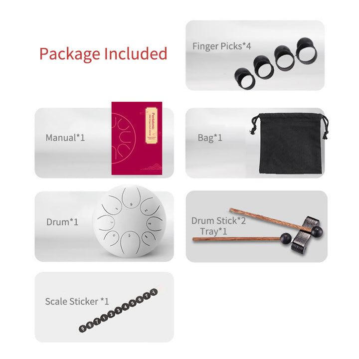 - Package: Manual*1, Scale Sticker *1, Drum Stick*2, Tray*1, Bag*1, Drum*1, Finger Picks*4
