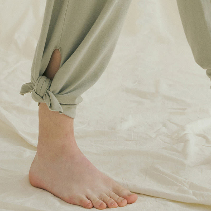 Buddha Stones Casual Loose Tie-down Hem Plain High Waist Women's Leica Pants With Pockets
