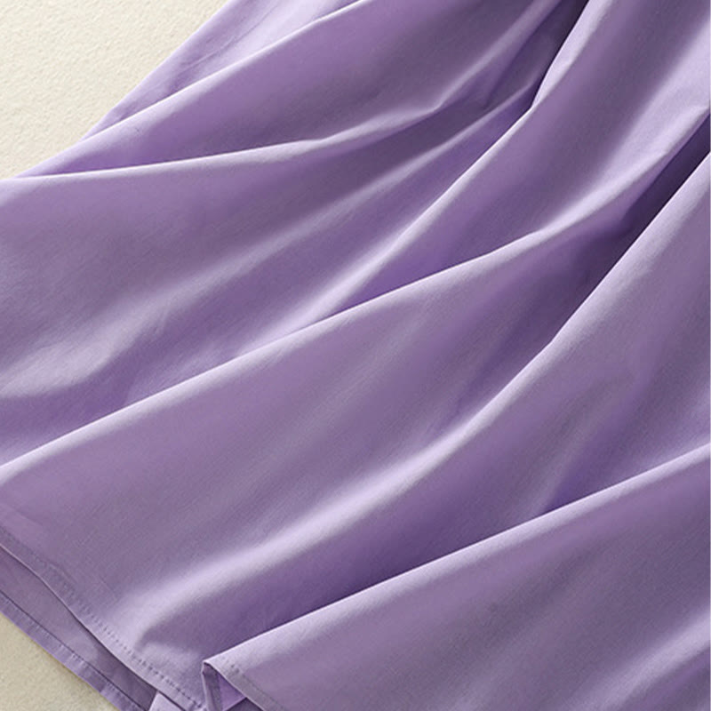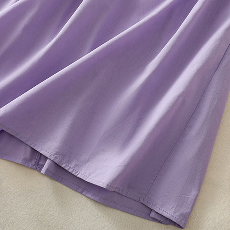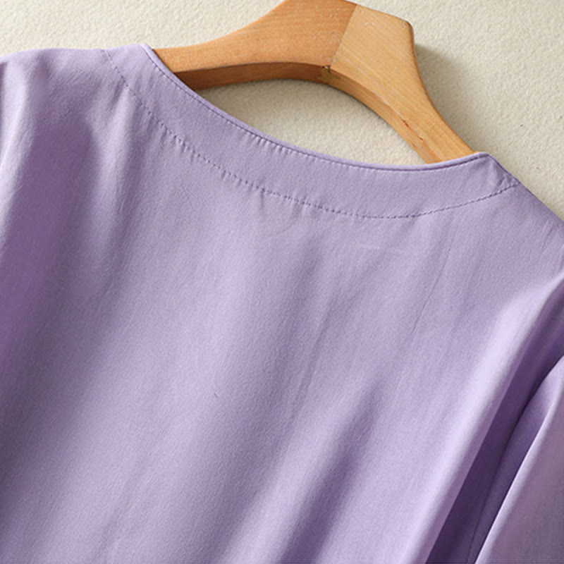 Buddha Stones Summer Orchid Embroidery Lace-Up V-Neck Half Sleeve Cotton Linen Midi Dress With Pockets