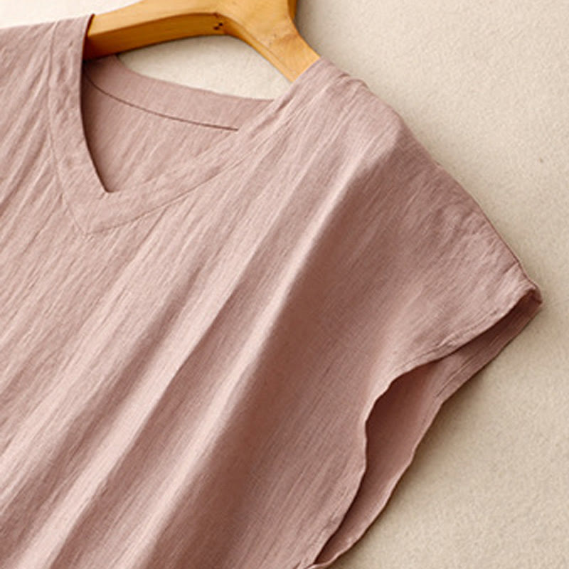 Buddha Stones Casual Artistic Solid Color Simple Design High Waist Short Sleeve Cotton Linen Midi Dress With Pockets