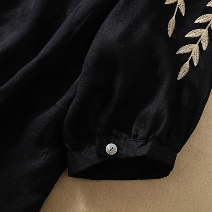 Buddha Stones Embroidery Leaves Women's Cotton Linen Half Sleeve T-shirt