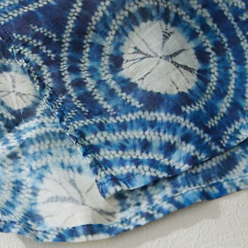 Buddha Stones Summer Blue Floral Stripes Circular Shape Stand Collar Design Short Sleeve Midi Dress With Pockets - image 5