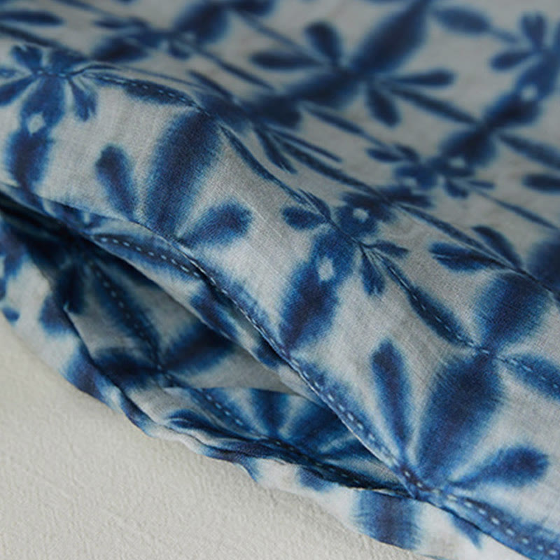 Buddha Stones Summer Blue Floral Stripes Circular Shape Stand Collar Design Short Sleeve Midi Dress With Pockets