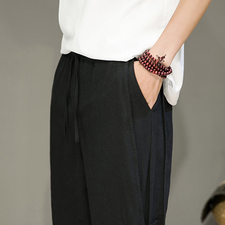 Buddha Stones Summer Vintage Drawstring Chinese Frog-Button Design Men's Cotton Linen Harem Pants With Pockets