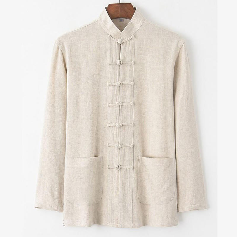 Buddha Stones 2Pcs Tang Suit Frog-Button Long Sleeve Shirt Pants Men's Set - Beige - US/UK/AU42,EU52 (4XL) - image 0