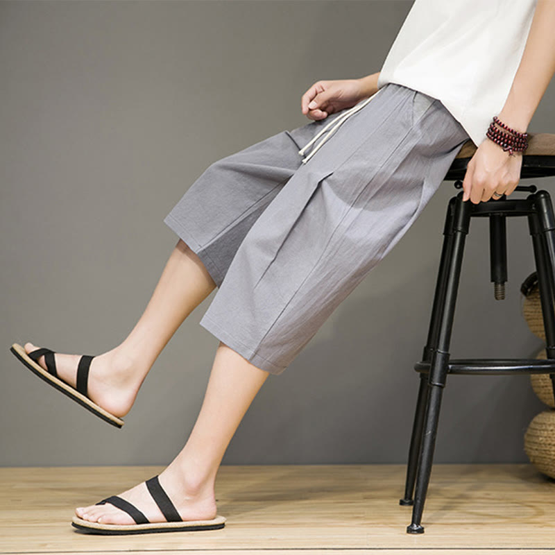 Buddha Stones Casual Summer Drawstring Solid Color Cropped Cotton Linen Men's Harem Pants With Pockets