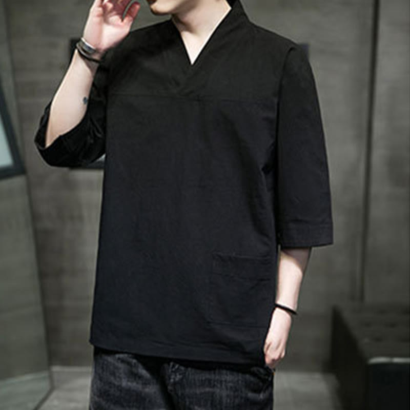 Buddha Stones Summer Casual Simple V-Neck Design Men's Cotton Linen Three Quarter Sleeve T-Shirt With Front Pocket - Black - US/UK/AU46,EU56 (5XL) - image 16