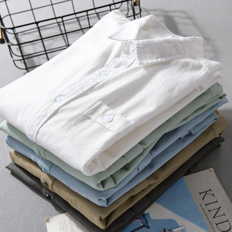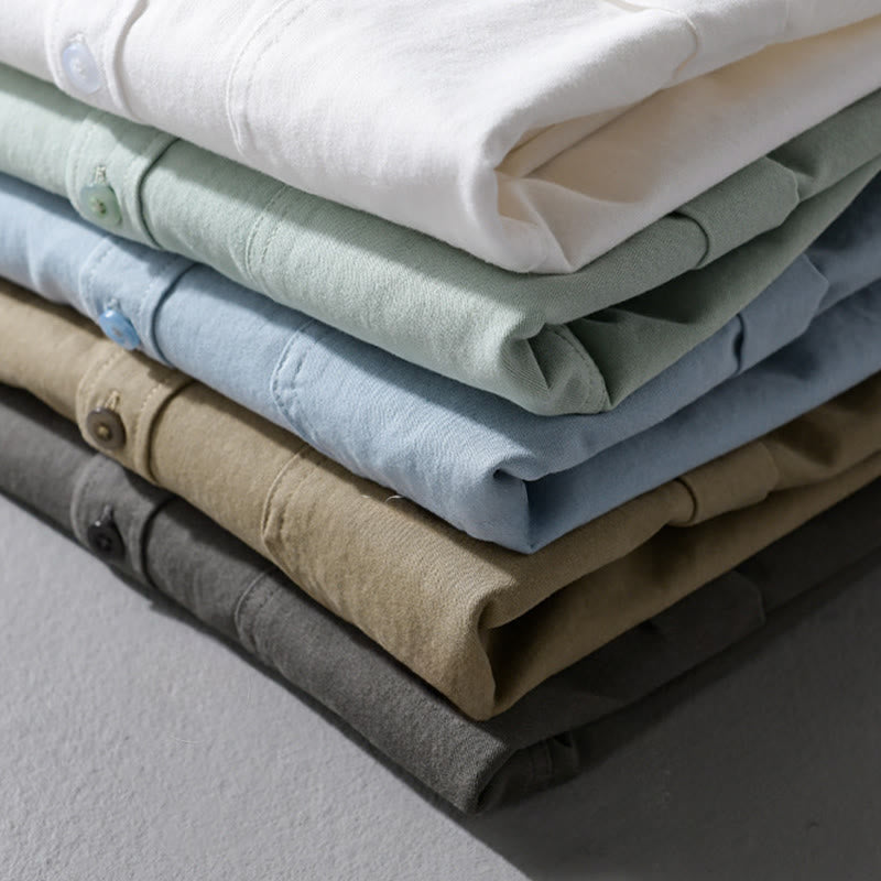 Buddha Stones Casual Solid Buttons Down Decorative Pocket Men's Stand Collar Long Sleeve Cotton Shirt