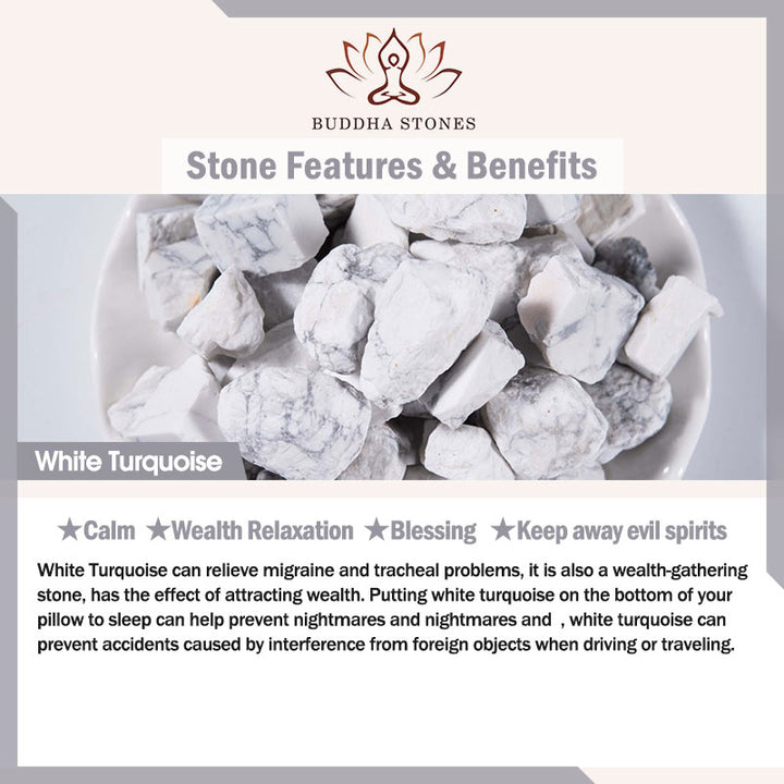 White Turquoise can relieve migraine and tracheal problems, it is also a wealth-gathering stone, has the effect of attracting wealth. Putting white turquoise on the bottom of your pillow to sleep can help prevent nightmares and nightmares and , white turquoise can prevent accidents caused by interference from foreign objects when driving or traveling.