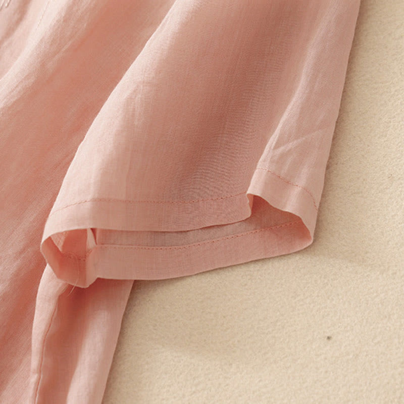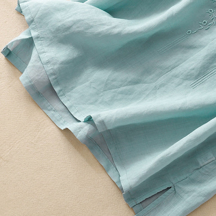 Buddha Stones Casual Women's Embroidered Flower V-neck Design Loose Half Sleeve Cotton Linen Shirt