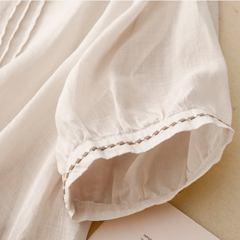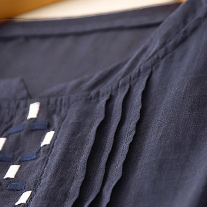 Buddha Stones Embroidery Crew Neck Pleats Women's Cotton Linen Half Sleeve T-shirt
