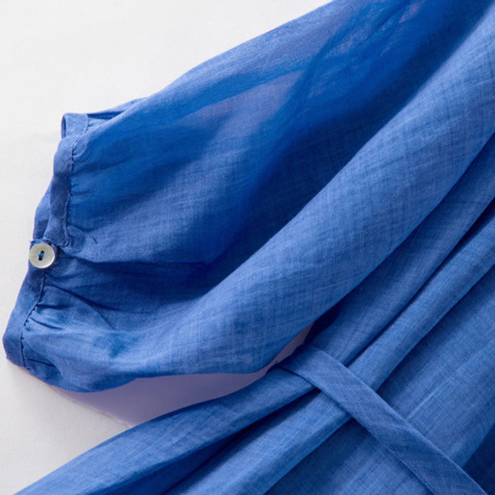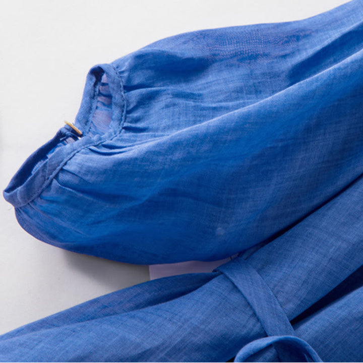 Buddha Stones Plain Drawstring Three Quarter Puff Sleeve Cotton Linen Midi Dress With Pockets - Blue - US12,UK/AU16,EU44 (XL) - image 1