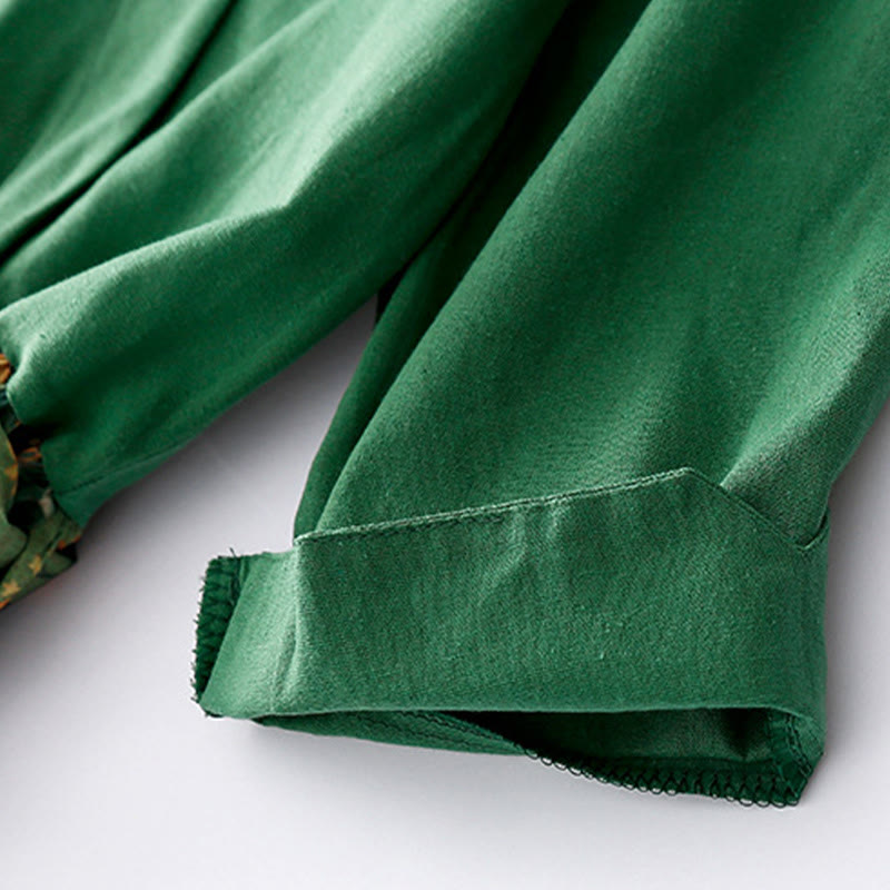 Buddha Stones Spring Flower Printed V-neck Half Sleeve Cotton Linen Midi Dress With Pockets - Green - US8-10,UK/AU12-14,EU40-42 (2XL) - image 1