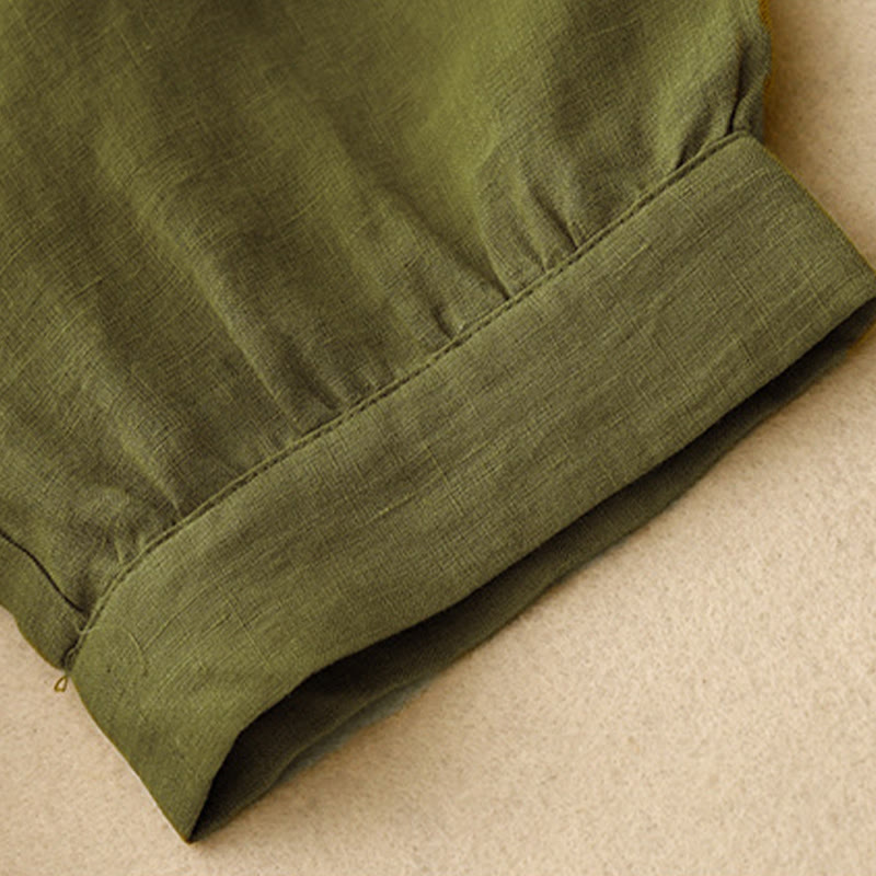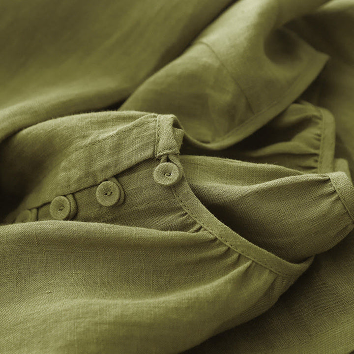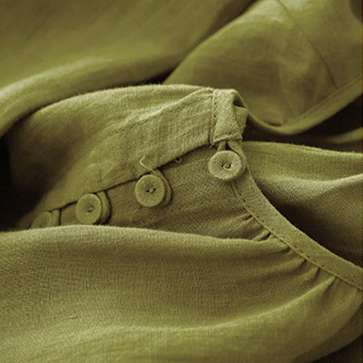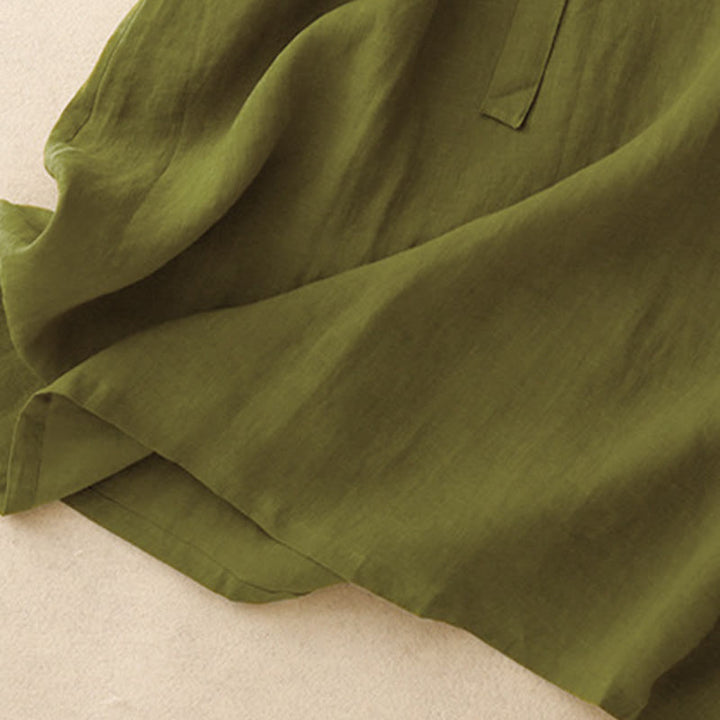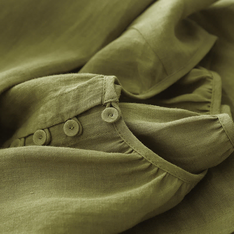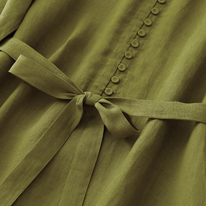 Buddha Stones Spring Plain Crew Neck Lace-up Half Sleeve Cotton Linen Midi Dress - OliveDrab - US14,UK/AU18,EU46 (2XL) - image 0
