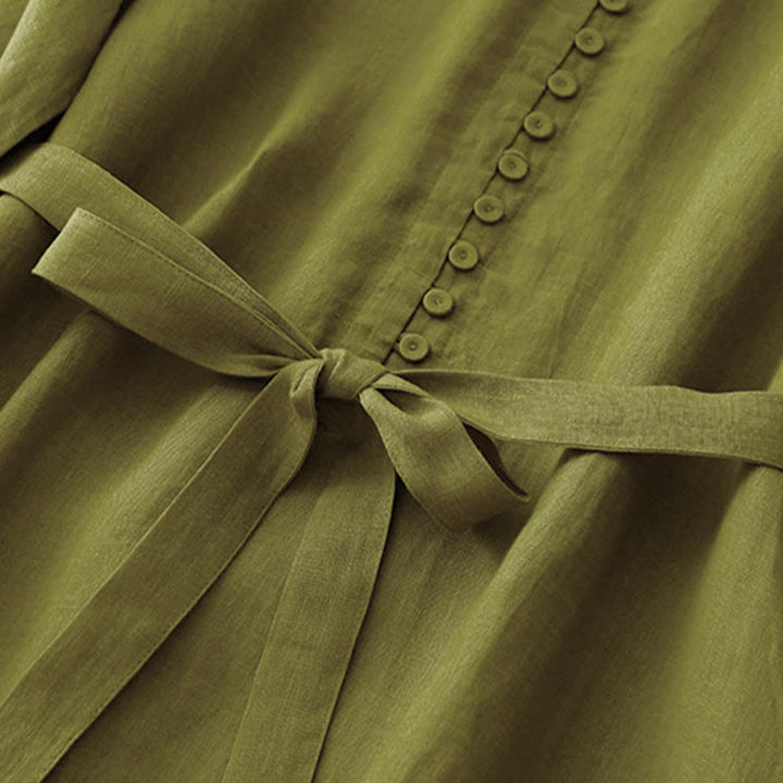Buddha Stones Spring Plain Crew Neck Lace-up Half Sleeve Cotton Linen Midi Dress