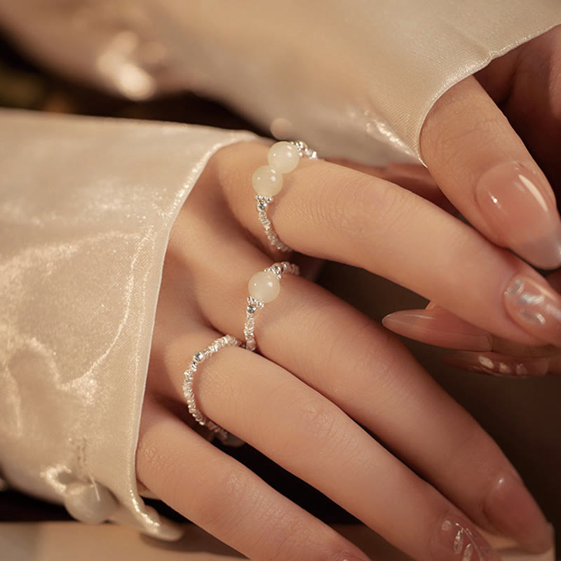 Buddha Stones 925 Sterling Silver Natural Small Hetian Jade Bead Luck Elastic Ring