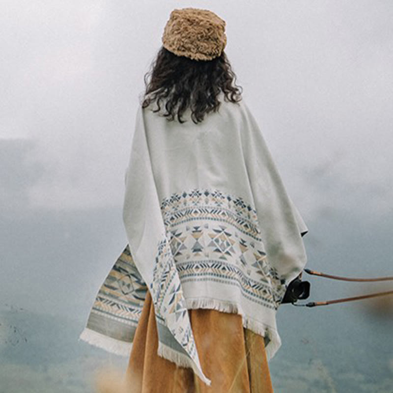 Buddha Stones Tibetan Beige Geometric Pattern Tassels Shawl Fall Winter Warm Scarf Wrap