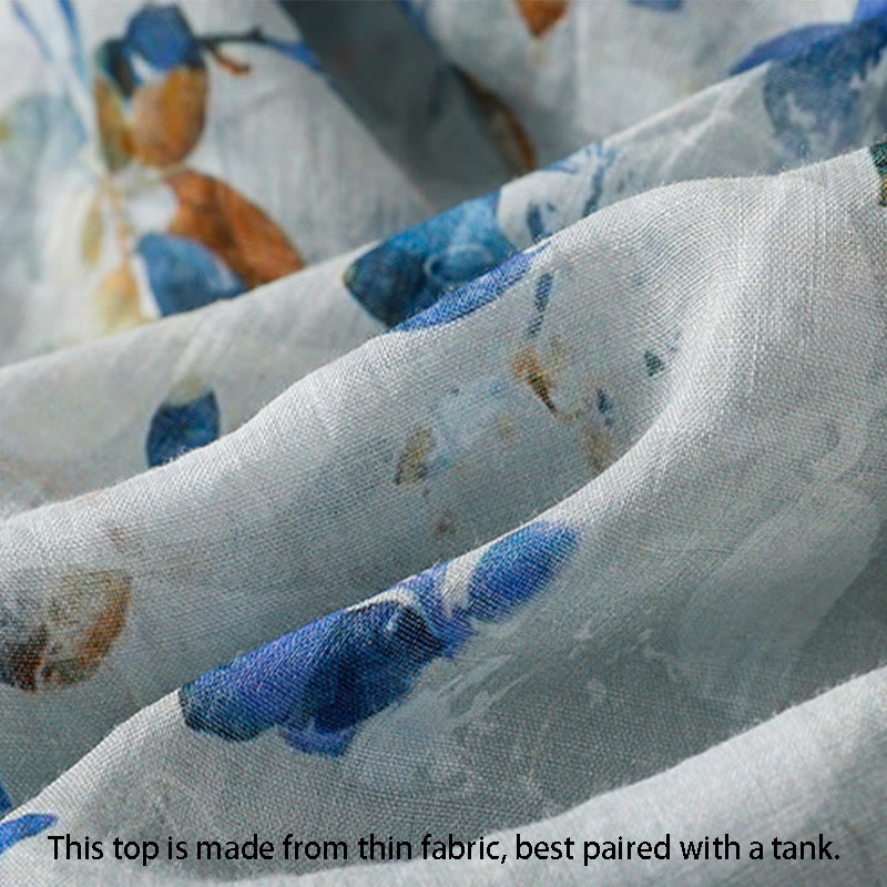 Buddha Stones Blue Floral V-Neck Three Quarter Sleeve Women's Cotton Shirt