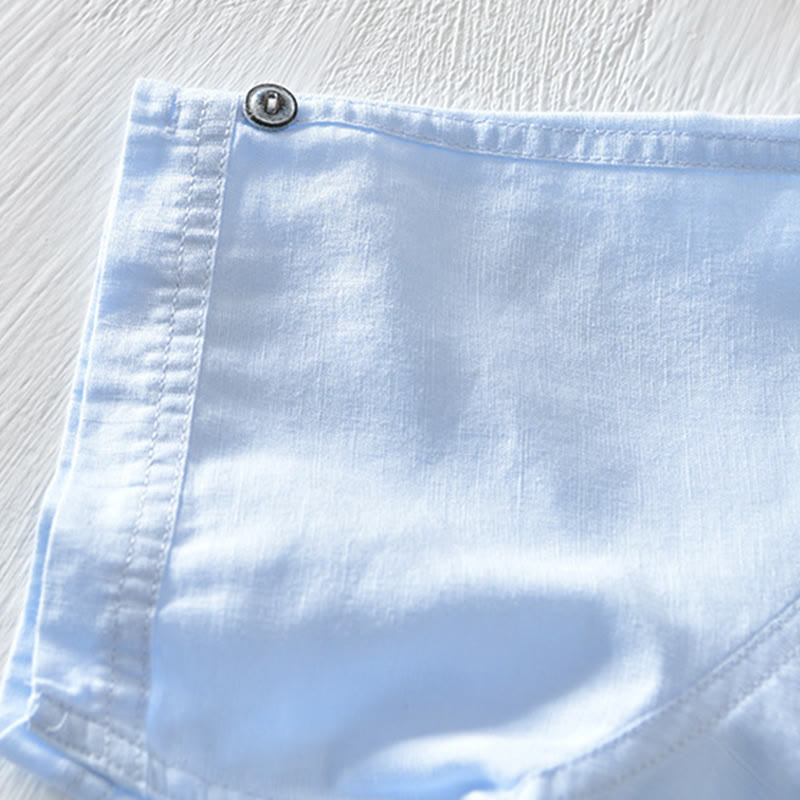 Buddha Stones Solid Color Half Button Design Stand Collar Men's Short Sleeve Cotton Linen Shirt