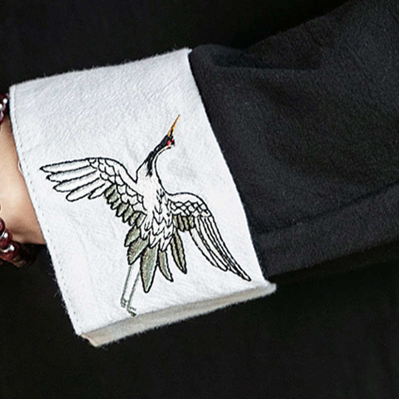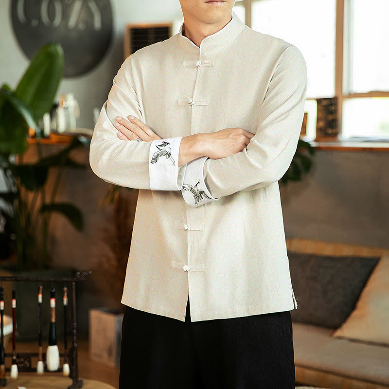 Buddha Stones Tang Suit Frog-Button Crane Embroidery Long Sleeve Cotton Men's Shirt
