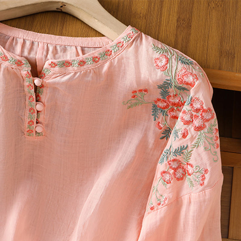 Buddha Stones Embroidery Button Three Quarter Sleeve Notched Neck Women's Cotton Shirt