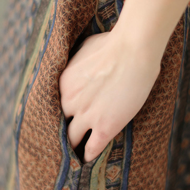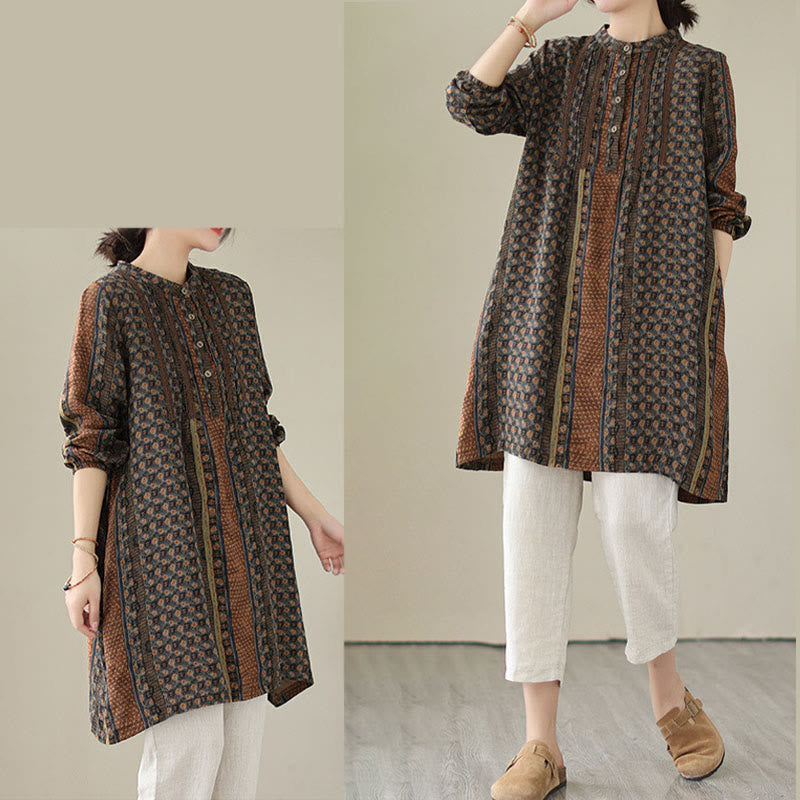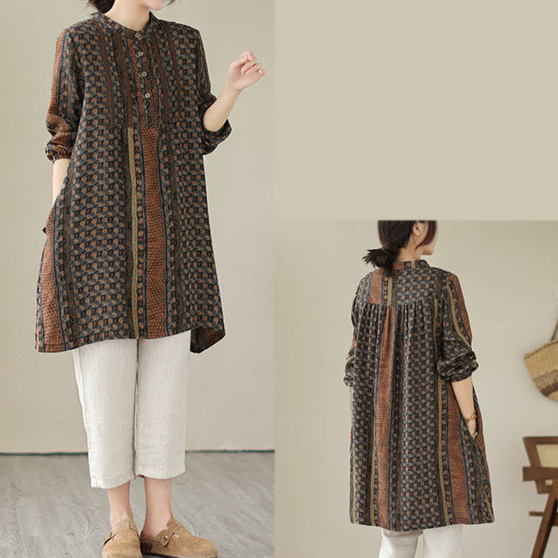 Buddha Stones Retro Printed Floral Women's Accordion Pleats Design Long Sleeve Shirt With Pockets - SaddleBrown - US8-10,UK/AU12-14,EU40-42 (2XL) - image 0