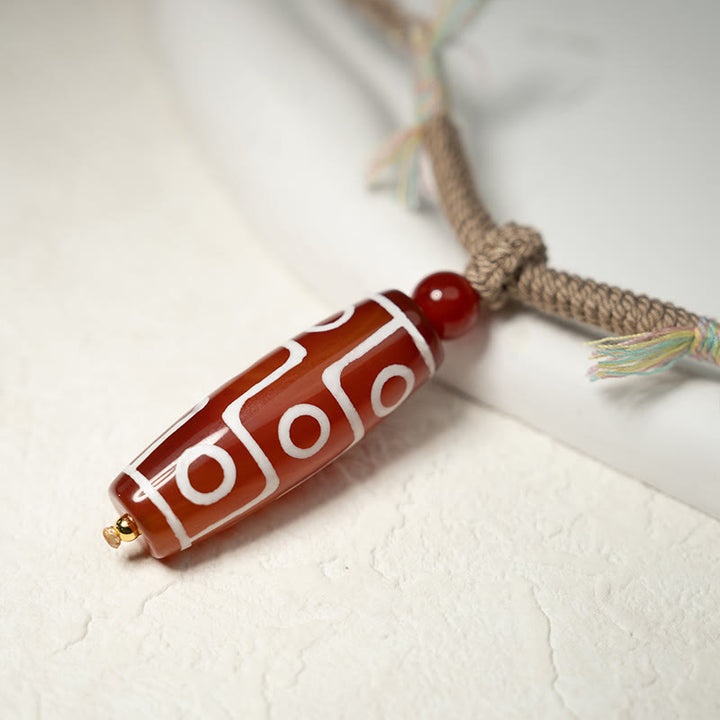 Dzi bead (Tib. གཟི།; pronounced "zee"; alternative spelling: gzi) is a type of stone bead of uncertain origin worn as part of a necklace and sometimes as a bracelet. Dzi beads are precious jewelry from Tibetan culture which is generally prized as protective amulets,these beads are believed to attract local protectors, dharmapalas or deities or maybe beneficial ghosts, ancestors or even bodhisattvas. Because of this, dzi beads are always treated with respect in Tibetan culture. Nine-Eye Dzi Bead is the symbol of The Nine Planets, It includes the activity of the Universe and the wisdom of the humanity. Nine-eyed beads is the most popular of all Dzis, brings all kinds of luck and blessings; protection, good health, purify negative energy expand intelligence and wisdom.It helps the investors with the successful development of new ideas in rolling in wealth.