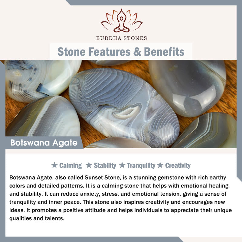Botswana Agate, also called Sunset Stone, is a stunning gemstone with rich earthy colors and detailed patterns. It is a calming stone that helps with emotional healing and stability. It can reduce anxiety, stress, and emotional tension, giving a sense of tranquility and inner peace. This stone also inspires creativity and encourages new ideas. It promotes a positive attitude and helps individuals to appreciate their unique qualities and talents.